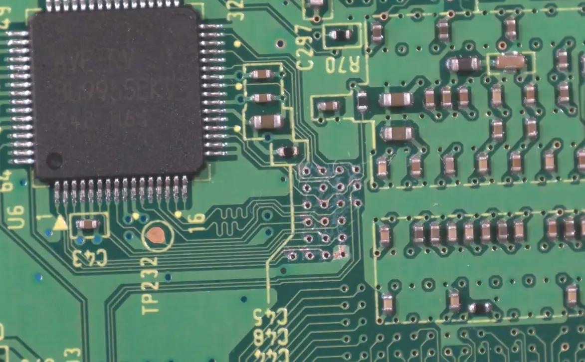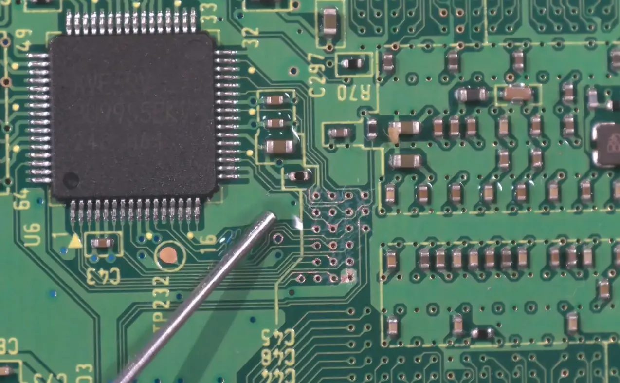 - Apply solder and distribute it so each via is fully tinned. Ensure there is no bridging between adjacent vias.
