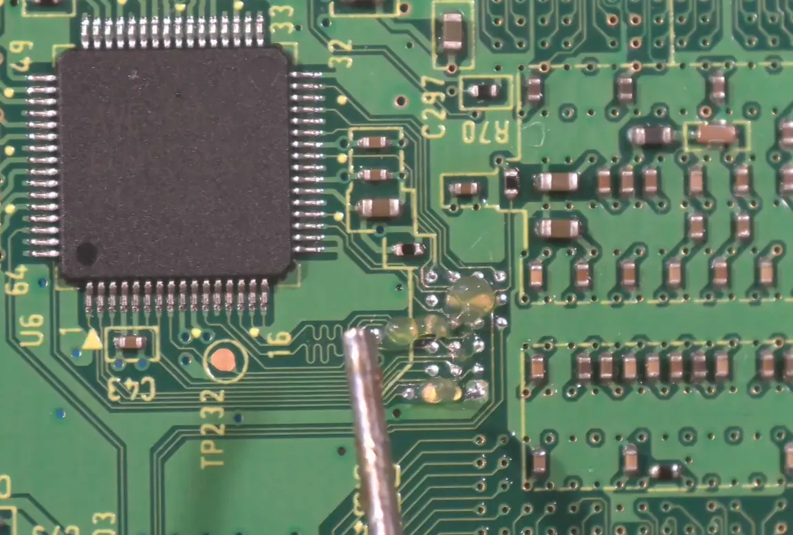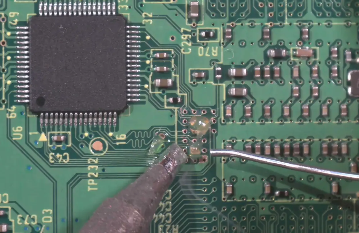 - Inspect for bridged component leads, pads, or vias. If necessary, apply flux and reflow the joint with the iron.
