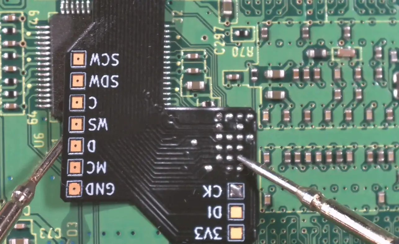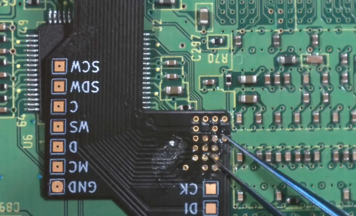 - Hold the flex in place with tweezers. Using a lightly tinned iron, solder each pad while applying gentle pressure so the flex sits flush against the board.