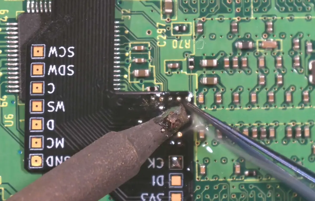 - Clean the area using a Q-tip and 91% isopropyl alcohol, then apply a fresh layer of flux over the tinned vias.