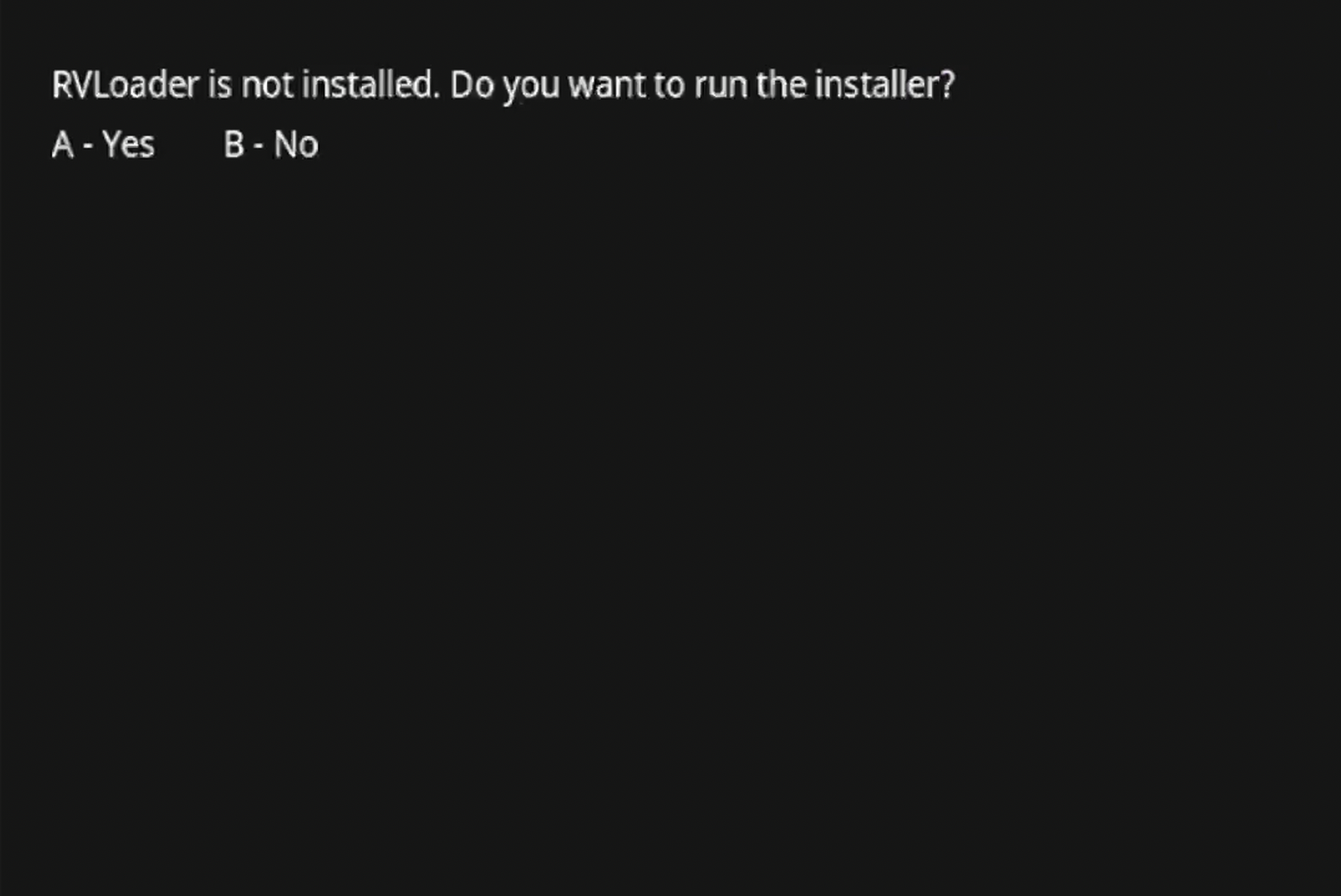 RVLoaderfrom the list and boot it by selectingLoad. A screen with the questionRVLoader is not installed. Do you want to run the installer?will be presented. PressAto continue, and set the configuration toPatch out WiFi: YesandEnable VGA: Yes. PressStart/Hometo run the install process.